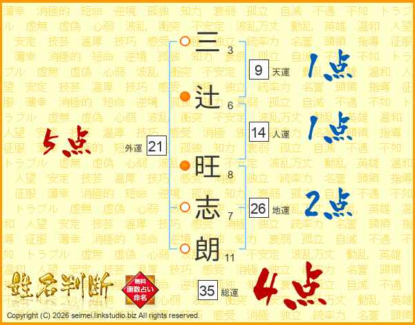 三(3画)辻(6画) 旺(8画)志(7画)朗(11画)