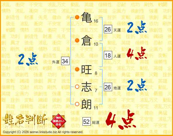 亀(16画)倉(10画) 旺(8画)志(7画)朗(11画)