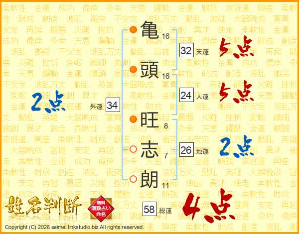 亀頭旺志朗さんの総運は58画の4点!