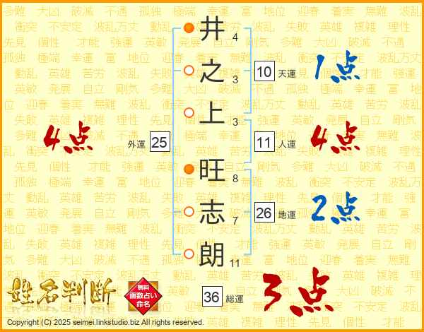 井(4画)之(3画)上(3画) 旺(8画)志(7画)朗(11画)