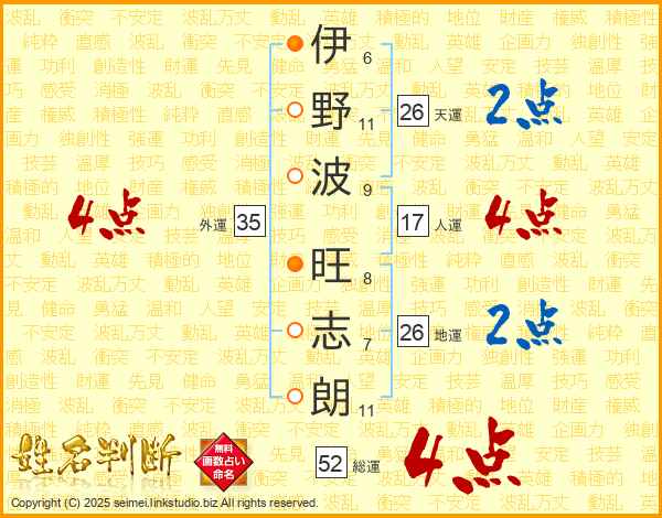 伊(6画)野(11画)波(9画) 旺(8画)志(7画)朗(11画)