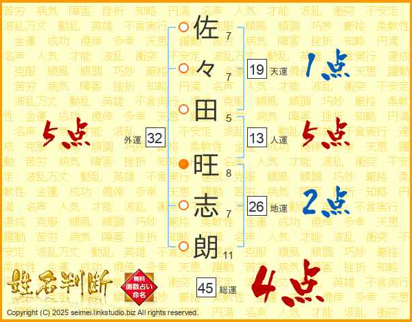 佐(7画)々(7画)田(5画) 旺(8画)志(7画)朗(11画)