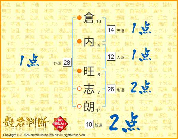 倉(10画)内(4画) 旺(8画)志(7画)朗(11画)