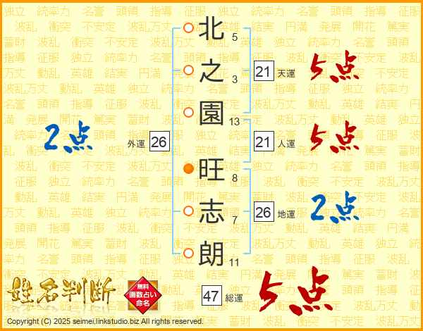 北(5画)之(3画)園(13画) 旺(8画)志(7画)朗(11画)