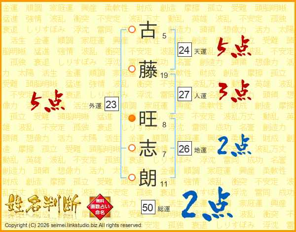 古(5画)藤(19画) 旺(8画)志(7画)朗(11画)