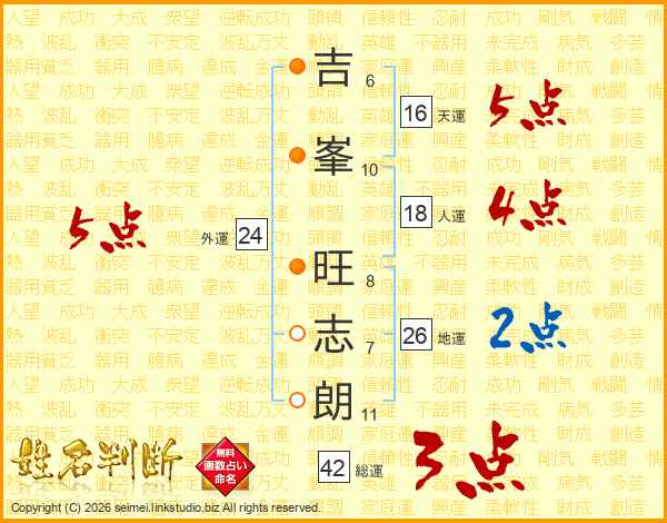 吉(6画)峯(10画) 旺(8画)志(7画)朗(11画)