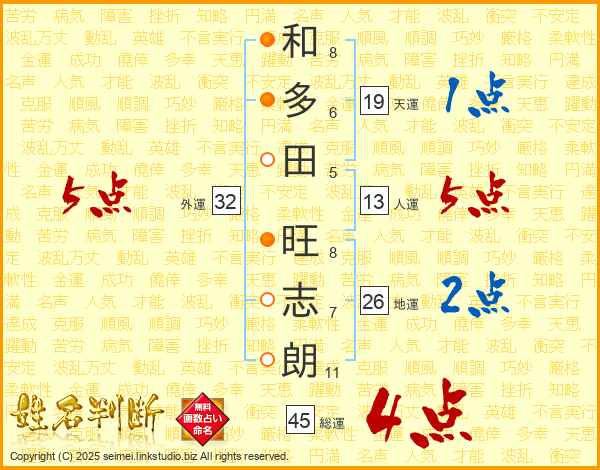和(8画)多(6画)田(5画) 旺(8画)志(7画)朗(11画)