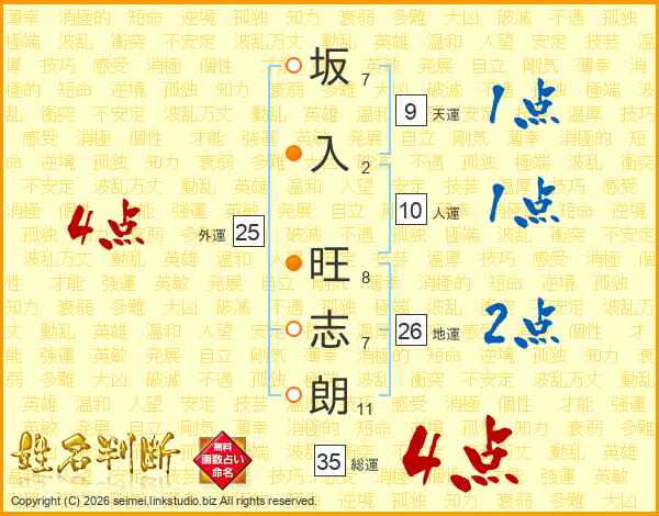 坂(7画)入(2画) 旺(8画)志(7画)朗(11画)