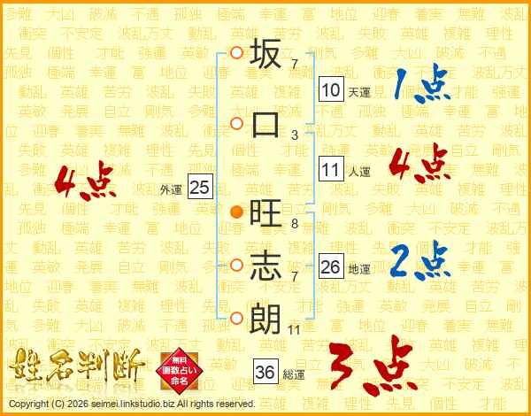 坂(7画)口(3画) 旺(8画)志(7画)朗(11画)