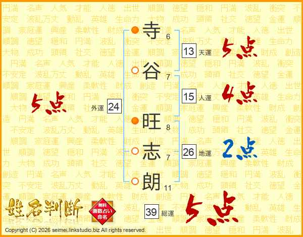 寺(6画)谷(7画) 旺(8画)志(7画)朗(11画)