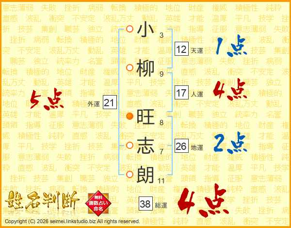 小(3画)柳(9画) 旺(8画)志(7画)朗(11画)