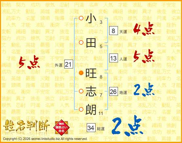 小(3画)田(5画) 旺(8画)志(7画)朗(11画)