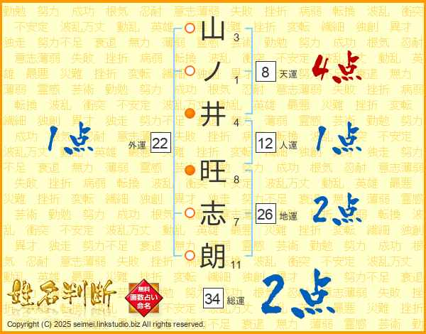 山(3画)ノ(1画)井(4画) 旺(8画)志(7画)朗(11画)