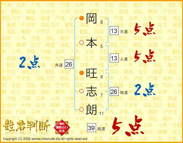 岡(8画)本(5画) 旺(8画)志(7画)朗(11画)