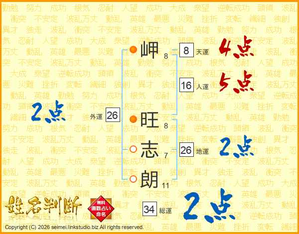 岬(8画) 旺(8画)志(7画)朗(11画)