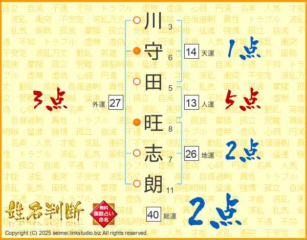 川(3画)守(6画)田(5画) 旺(8画)志(7画)朗(11画)