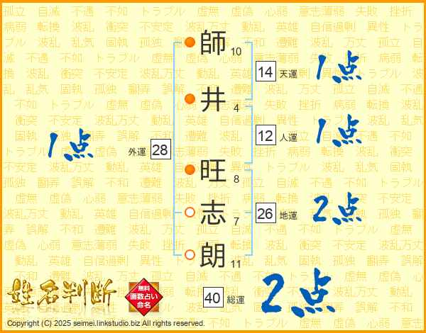 師(10画)井(4画) 旺(8画)志(7画)朗(11画)