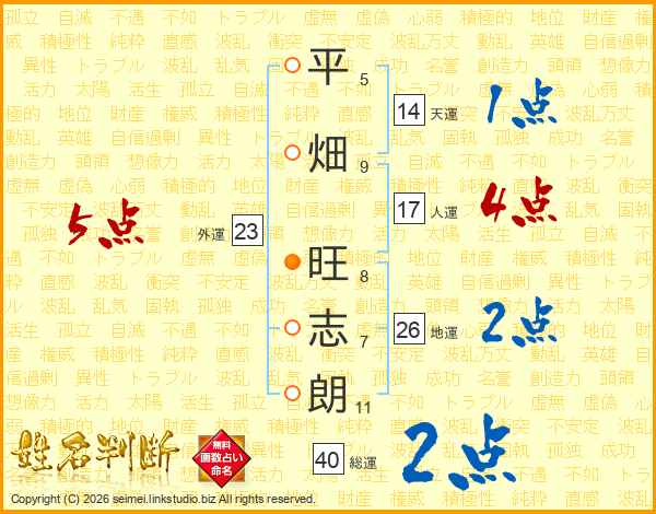 平(5画)畑(9画) 旺(8画)志(7画)朗(11画)