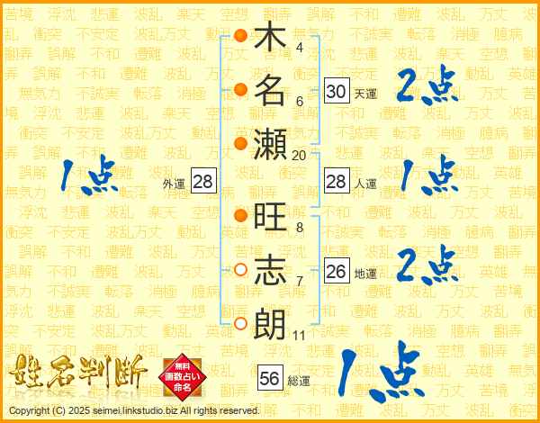 木(4画)名(6画)瀬(20画) 旺(8画)志(7画)朗(11画)