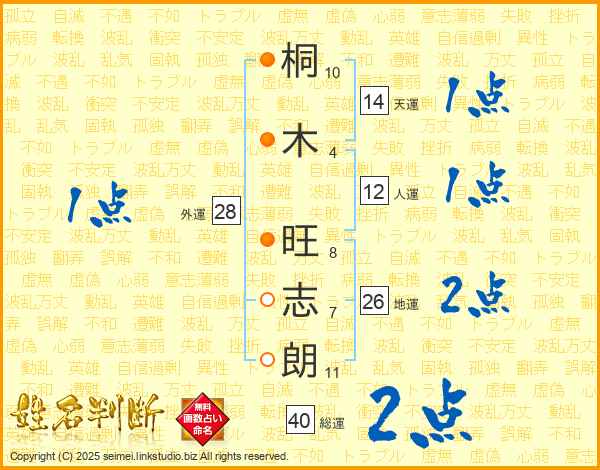 桐(10画)木(4画) 旺(8画)志(7画)朗(11画)