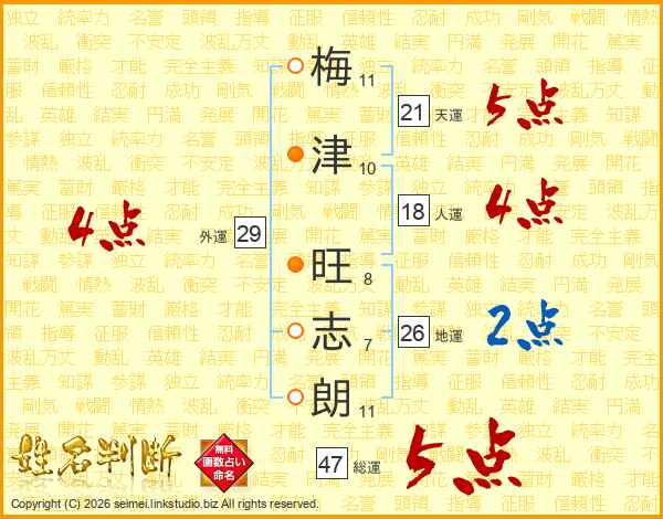 梅(11画)津(10画) 旺(8画)志(7画)朗(11画)