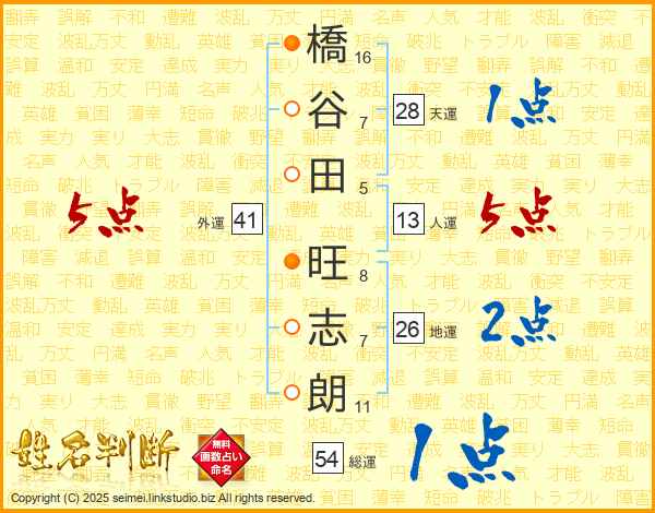 橋(16画)谷(7画)田(5画) 旺(8画)志(7画)朗(11画)