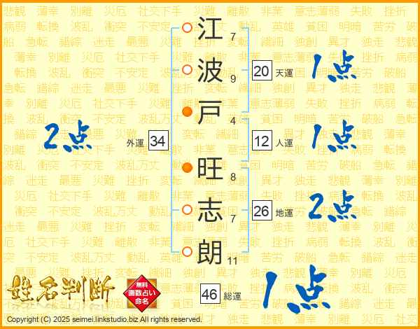 江(7画)波(9画)戸(4画) 旺(8画)志(7画)朗(11画)