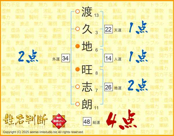 渡(13画)久(3画)地(6画) 旺(8画)志(7画)朗(11画)
