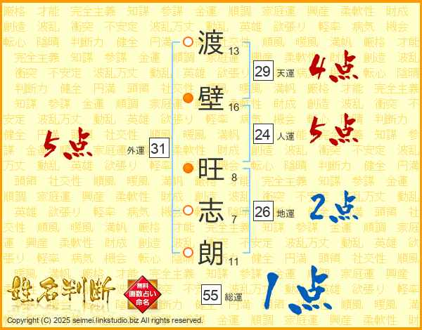 渡(13画)壁(16画) 旺(8画)志(7画)朗(11画)