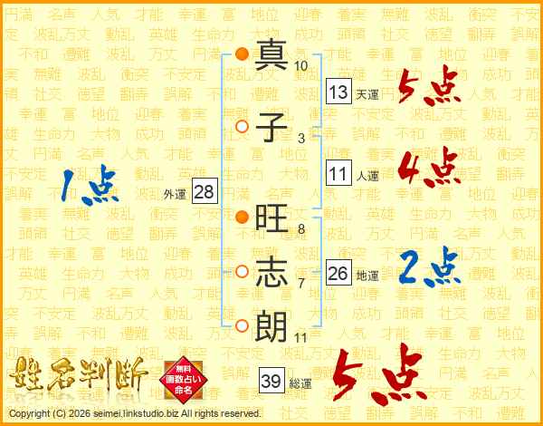 真(10画)子(3画) 旺(8画)志(7画)朗(11画)
