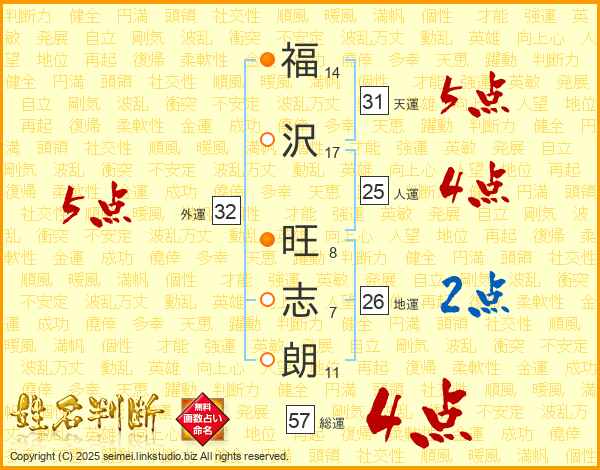 福(14画)沢(17画) 旺(8画)志(7画)朗(11画)