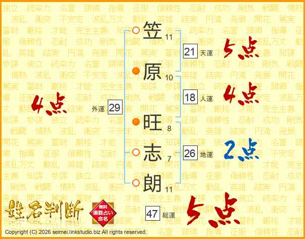笠(11画)原(10画) 旺(8画)志(7画)朗(11画)