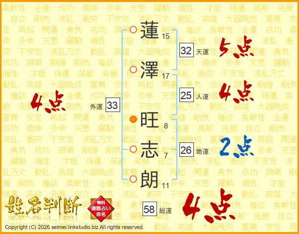 蓮(15画)澤(17画) 旺(8画)志(7画)朗(11画)