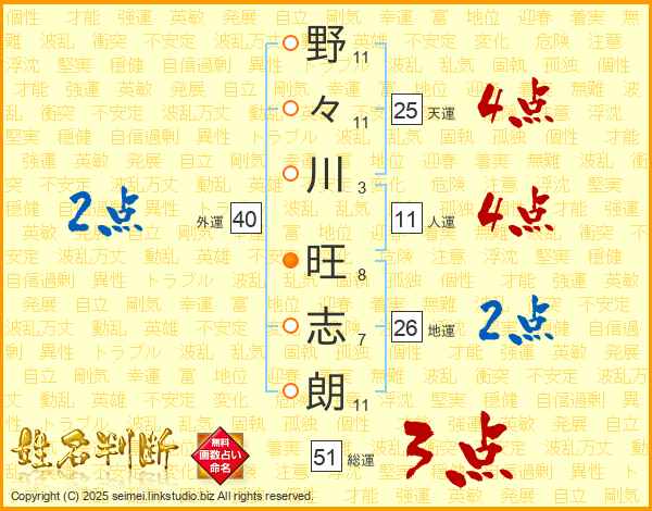 野(11画)々(11画)川(3画) 旺(8画)志(7画)朗(11画)