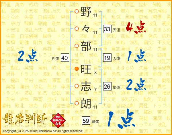 野(11画)々(11画)部(11画) 旺(8画)志(7画)朗(11画)