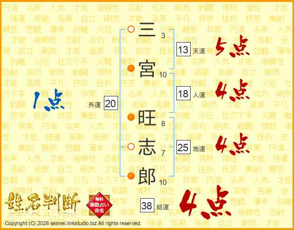 三(3画)宮(10画) 旺(8画)志(7画)郎(10画)