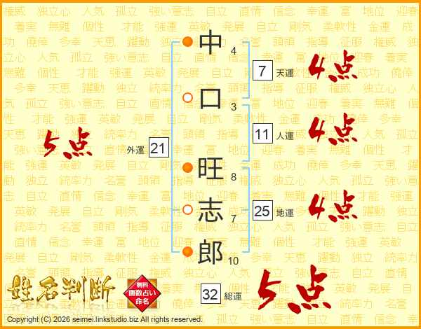 中(4画)口(3画) 旺(8画)志(7画)郎(10画)