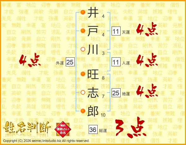 井(4画)戸(4画)川(3画) 旺(8画)志(7画)郎(10画)