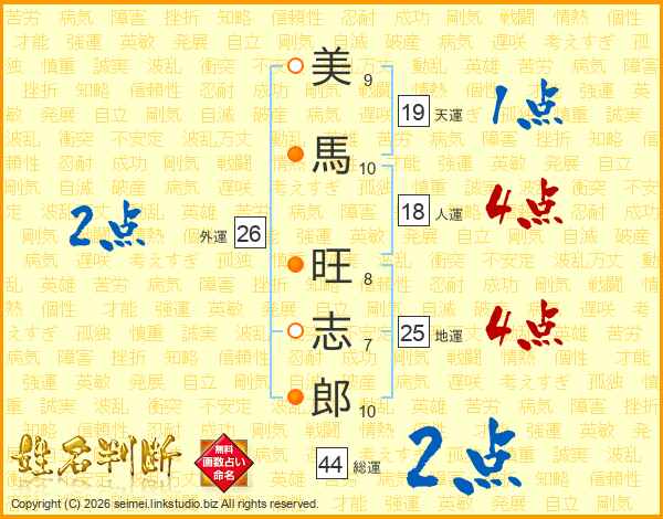 美(9画)馬(10画) 旺(8画)志(7画)郎(10画)