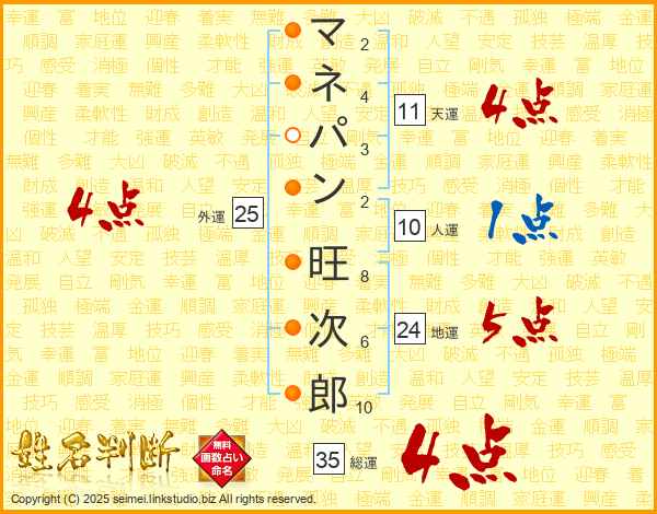 マ(2画)ネ(4画)パ(3画)ン(2画) 旺(8画)次(6画)郎(10画)