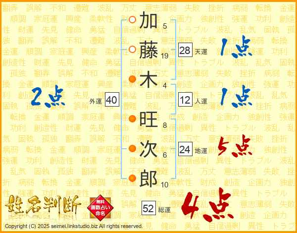 加(5画)藤(19画)木(4画) 旺(8画)次(6画)郎(10画)