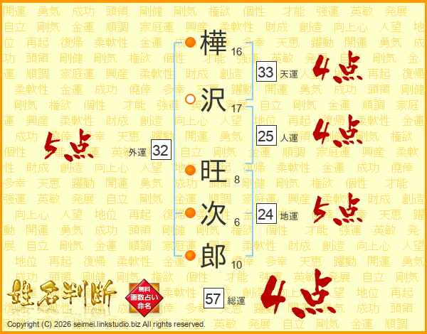 樺(16画)沢(17画) 旺(8画)次(6画)郎(10画)