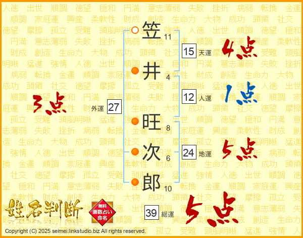笠(11画)井(4画) 旺(8画)次(6画)郎(10画)
