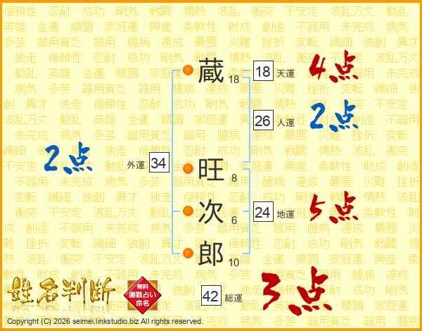 蔵(18画) 旺(8画)次(6画)郎(10画)