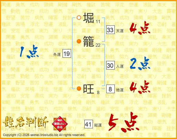 堀(11画)籠(22画) 旺(8画)