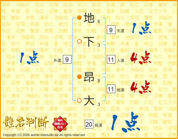 生活面を象徴する運勢です。外部から受ける影響力を表し、結婚運、家庭運や職場、環境への順応性を表します。総運から人運を引いた画数。姓や名が1文字の場合を除く。