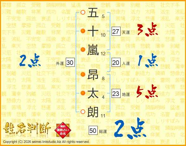 五(5画)十(10画)嵐(12画) 昂(8画)太(4画)朗(11画)
