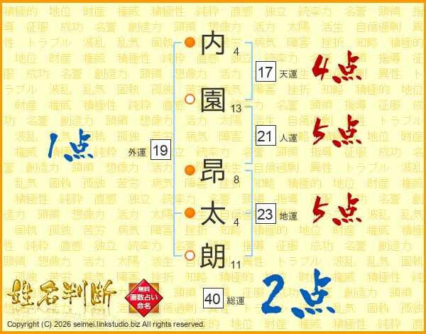 内(4画)園(13画) 昂(8画)太(4画)朗(11画)