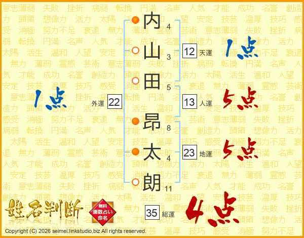 内(4画)山(3画)田(5画) 昂(8画)太(4画)朗(11画)