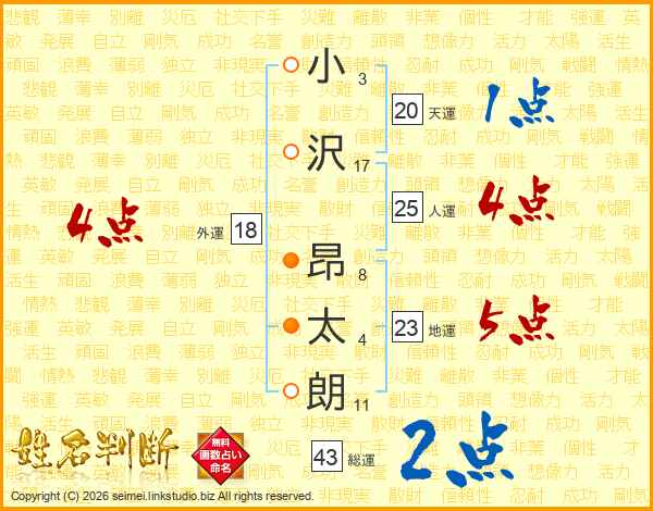 小(3画)沢(17画) 昂(8画)太(4画)朗(11画)